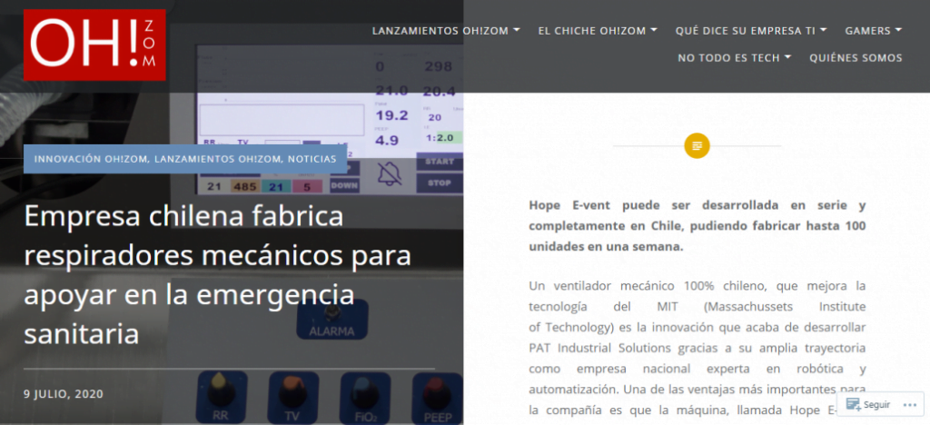 Un ventilador mecánico 100% chileno, que mejora la tecnología del MIT (Massachussets Institute of Technology) es la innovación que acaba de desarrollar PAT Industrial Solutions gracias a su amplia trayectoria como empresa nacional experta en robótica y automatización. Una de las ventajas más importantes para la compañía es que la máquina, llamada Hope E-vent, puede ser desarrollada en serie y completamente en Chile, pudiendo fabricar hasta 100 unidades en una semana.